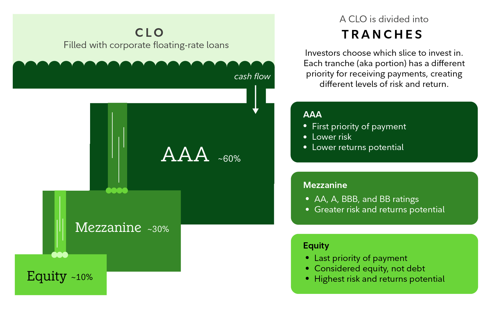 CLOs are structures that pool together a large number of underlying corporate loans. CLOs then issue securities backed by those loans, but with varying levels of seniority. For example, AAA-rated CLO securities have first claim on the cash flows paid by the pool of loans. Lower-rated securities issued by the CLO only receive payment after the higher-rated securities are paid up.