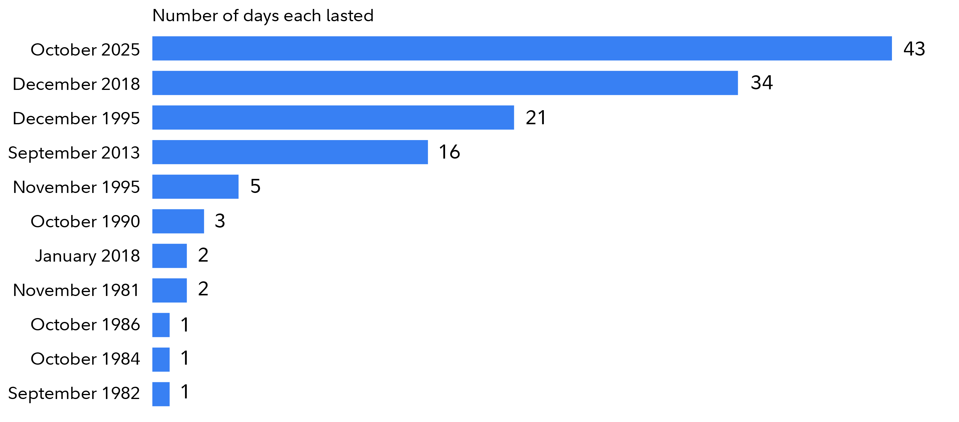 Shutdowns are hardly a rarity. As of the end of 2025 the government had faced a total of 11 shutdowns, starting with the first shutdowns in the early 1980s. History shows these shutdowns have ranged from very brief to more prolonged, but even the longer ones have had limited market impact.
