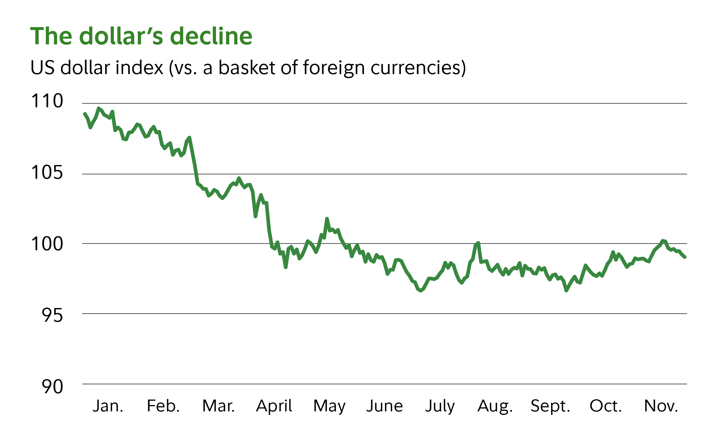 Past performance is no guarantee of future results. Chart shows the value of the dollar as represented by the US Dollar Index (DXY), which measures the US dollar against a basket of 6 developed-market currencies (euro, Japanese yen, British pound, Canadian dollar, Swedish krona, Swiss franc). Data as of November 14, 2025. Source: Fidelity Investments. This information is for illustrative purposes only and should not be considered investment advice.