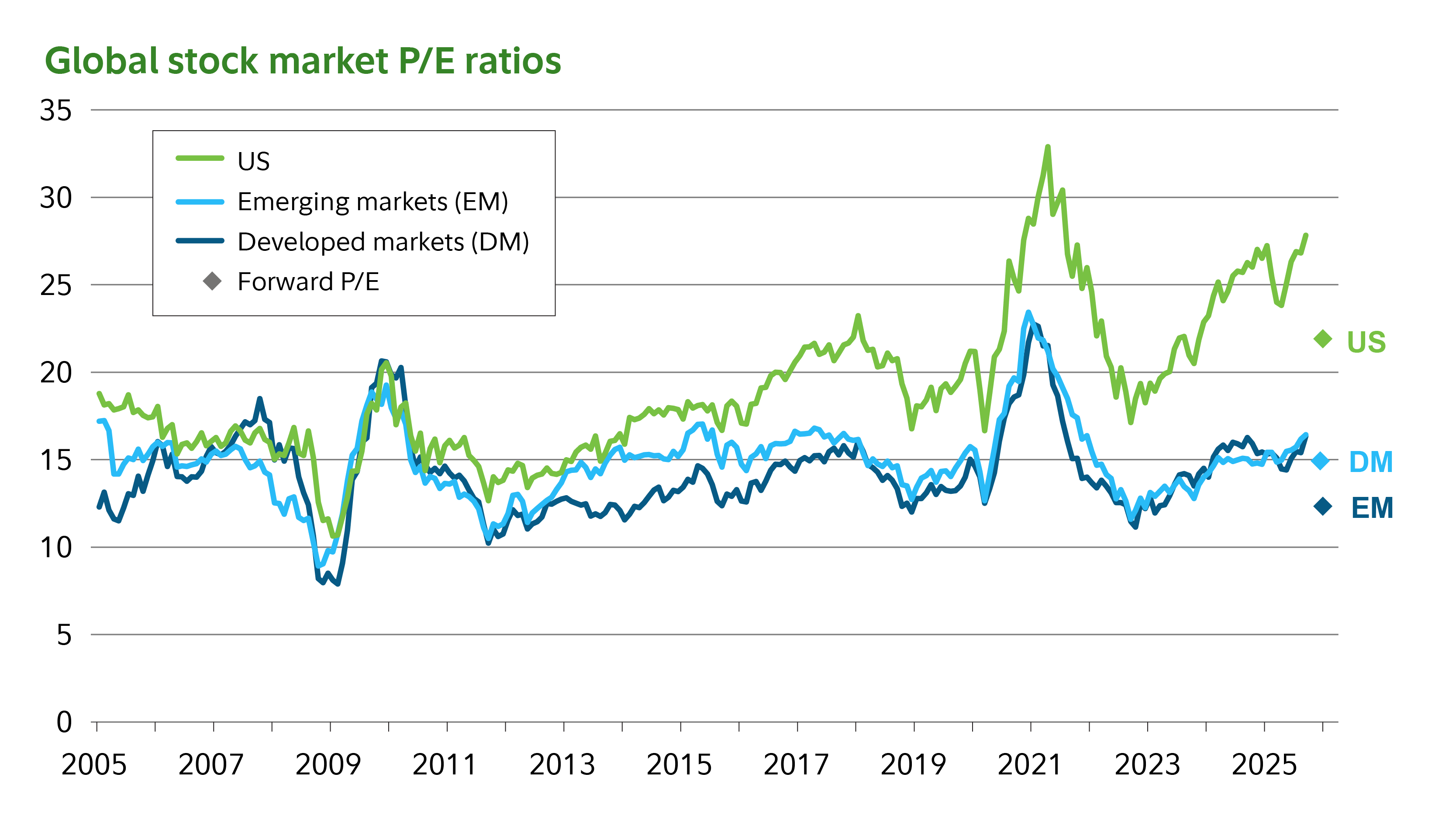 Past performance is no guarantee of future results. Line chart shows trailing 12-month P/E ratios, meaning price divided by previous 12-month actual earnings. Forward P/E ratio represents price divided by consensus analyst estimated earnings for subsequent 12 months. Long-term average P/E is based on data from Dec. 31, 2004, to Sept. 30, 2025. Chart data as of Sept. 30, 2025. US stocks represented by the S&P 500 Index. Developed market stocks represented by the MSCI EAFE Index. Emerging market stocks represented by MSCI Emerging Markets Index. Sources: FactSet, Bloomberg LP, Fidelity Investments Asset Allocation Research Team. This information is for illustrative purposes only and should not be considered investment advice.